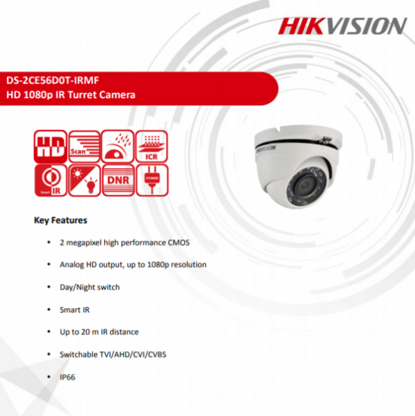 - Kamera DS-2CE56D0T-IRMF, HD-TVI, 2 Mpix, HD, Turret